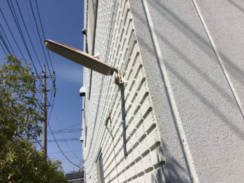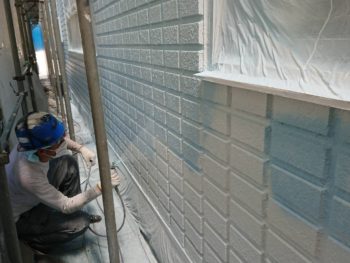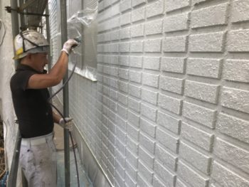 凹凸のある外壁面は吹付塗装を行いました。外壁の下塗りからです。