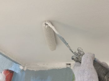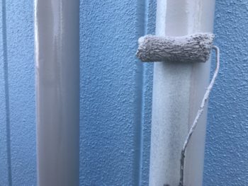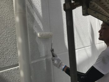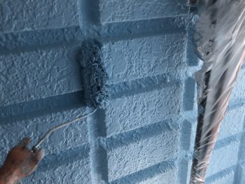 ムラがないようにローラーでならしながら吹付塗装を行います。外壁上塗り中