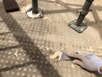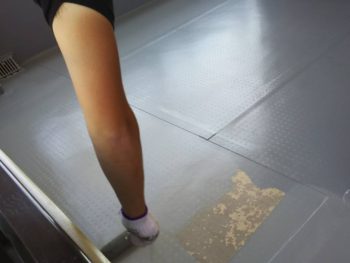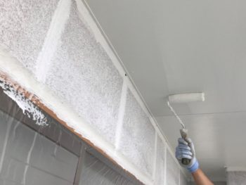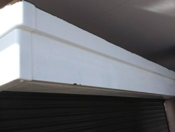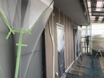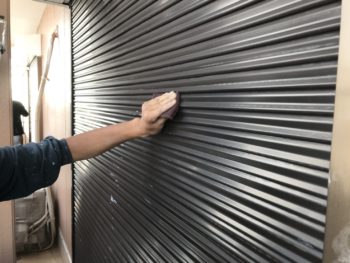 シャッターは吹付塗装を行うので、ケレン作業後に養生作業を行います