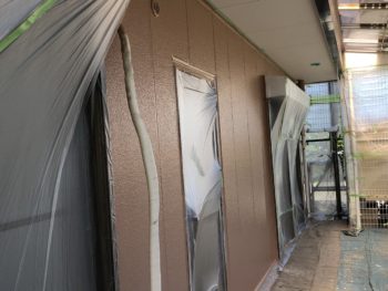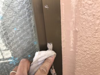 サッシやデッキなど塗料をつけない箇所はビニールや布で保護していきます