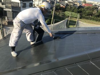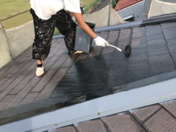 屋根上塗り中。色の違いが多少あるので塗り残しの無いように塗ります。