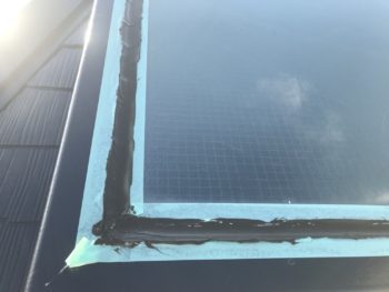 上塗りを行うと屋根上に上がれないので先にトップライトのコーキング処理を行います。