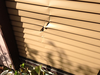 | 工事前の状況 | 先日の大風で屋根の部品が飛んでしまいました。お隣の雨戸を破損してしまいましたのでそちらも一緒に直したいと思います。火災保険が使用できればと思います。先々、大規模の工事を考えていますので今回は、簡易的な工事でお願いします。(F様より) |