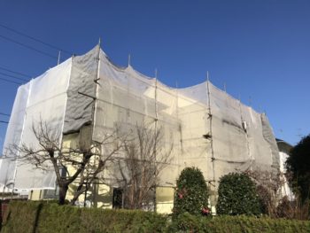 まずは足場を組み立てます。その後、飛散防止ネットを設置します。