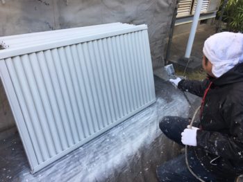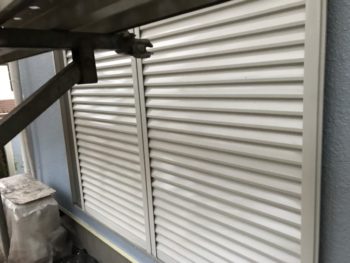 雨戸はローラーで塗装出来ないので、吹付塗装を行います。