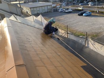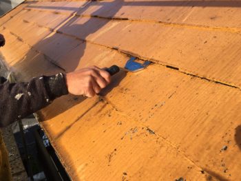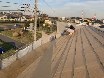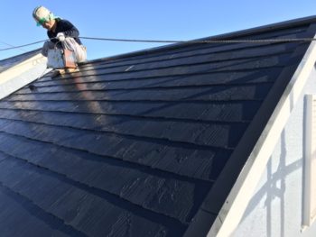 屋根も外壁と同様に3回塗ります。下塗りは透明な塗料です。