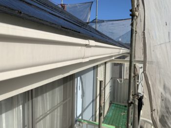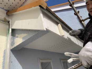 軒天の塗装です。塗料が飛散するので外壁上塗り前に仕上げます。